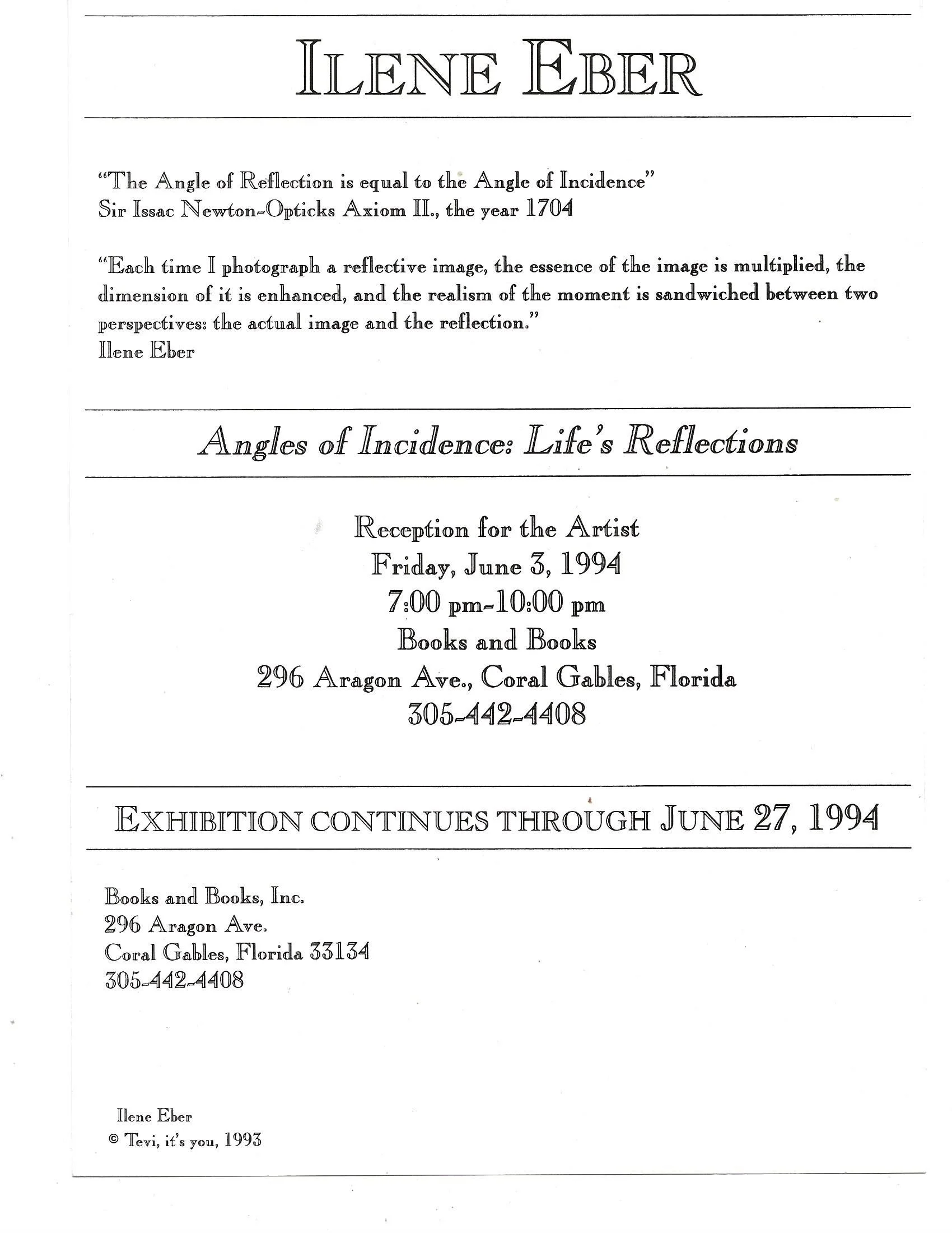 ”Angles of Incidence: Life’s Reflections”; One Woman Show, Books & Books, Coral Gables, FL.
